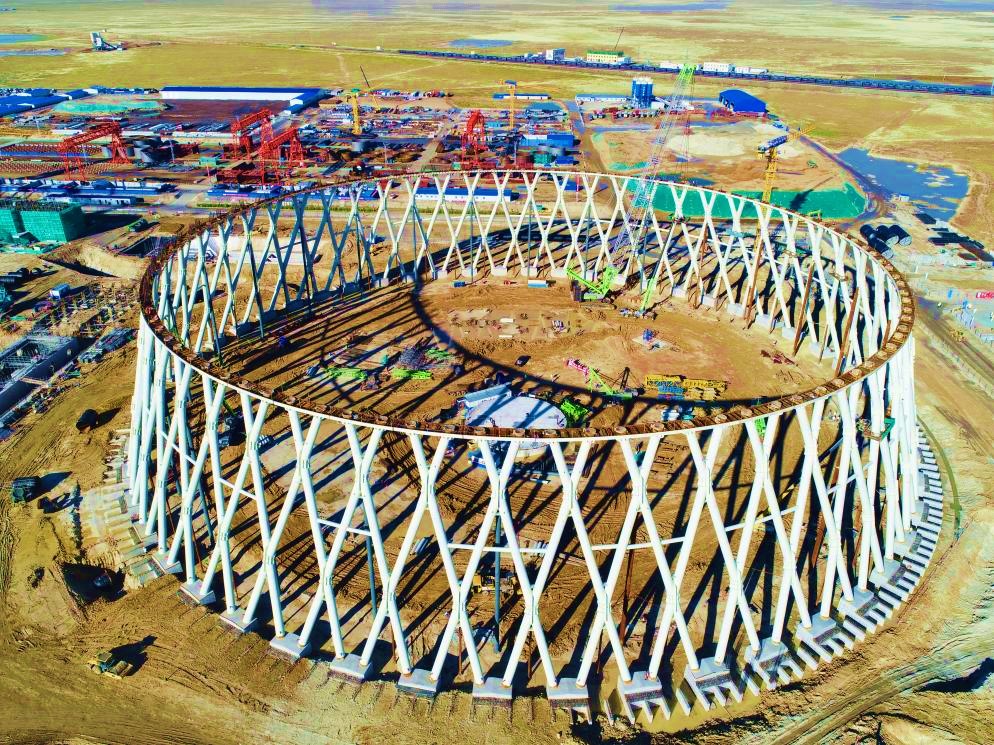 烟塔施工分公司中煤芒来电厂2×66万千瓦煤电一体化项目间冷塔双交叉钢管X柱顺利合拢